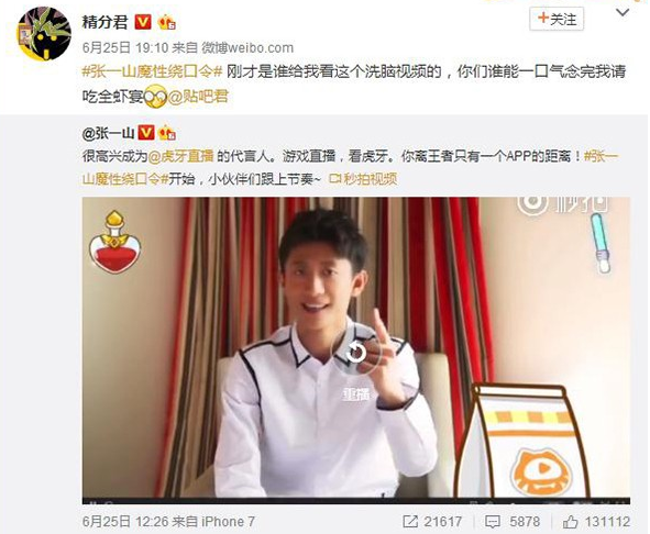 在大家圍不雅觀此“男”真面目的期待中, 90 后“演技扛把子”張一山閃亮登場,正式頒布頒發代言消息。在代言視頻中,張一山再次實力演繹尬代言,從《家有兒女》的老爸老媽小雨小雪,到《高能少年團》的小董大陸小凱昊然,張一山親友團全體出動,魔性繞口令一口一個都說好,聽到耳朵懷孕,腦內循環播放。張一山洗腦模式全開,讓娛樂圈、電競圈各位大咖紛紛中槍,一時強勢點贊無數瘋狂傳播不竭。而躺槍網友們也紛紛體現“這波我服”,“別說了,我下載虎牙直播APP還不行嗎?”