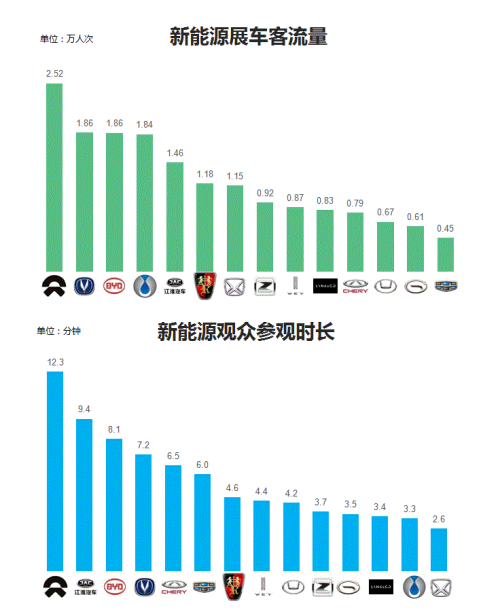 1) 蔚來成為新能源汽車的黑馬,其展車吸引了2. 52 萬人次參不雅觀;長安、比亞迪、騰勢的新能源展車總客流量超過1. 8 萬人