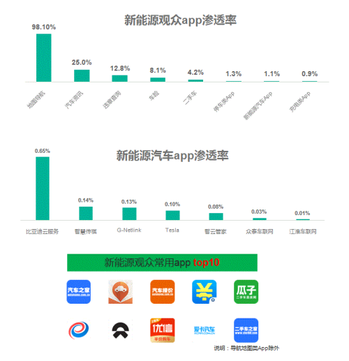 1) 使用汽車類app的國產新能源不雅觀眾中,98.1%的不雅觀眾均安置過地圖導航類app,其中高德地圖、百度地圖的滲透率最高,達57%擺布