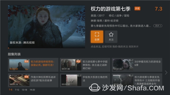 沙發管家下載的“騰訊視頻TV版”搜索權力的游戲首字母即可看到1-6部完整資源。