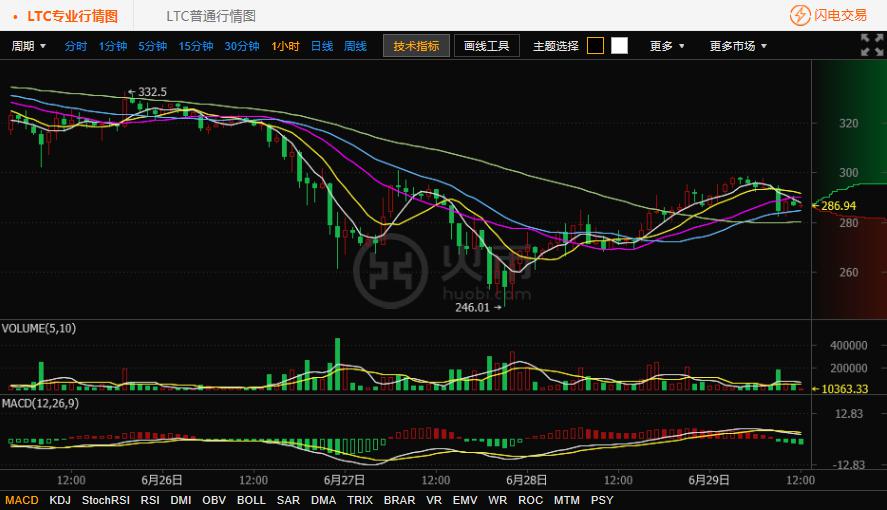 看火幣網萊特幣行情小時圖,火幣網萊特幣今日再次觸及 300 元整數關口,但未能有效站穩,與火幣網比特幣相似的是,本輪反彈量能同樣很小,可以看出,火幣網萊特幣近期飾演更多的是跟隨者角色,暫時沒有走獨立行情的能力,目前下方支撐位 270 元,上方壓力位 300 元,在成交量不能有效放大的情況下,以區間震蕩為主。