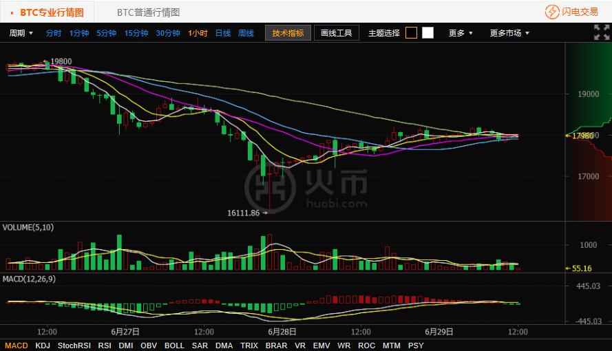 看火幣網比特幣行情小時圖。火幣網比特幣自昨日開始反彈,從反彈的過程來看,,整體反彈成交量要遠遠小于下跌時的成交量,制約反彈的空間,反彈至上方壓力 18200 元附近后,出現必然量的拋壓。目前多條均線粘合,MA5 下穿多條均線,同時MACD處于高位死叉,綠柱有所增長。火幣網溫馨提示:投資有風險,入市需謹慎。