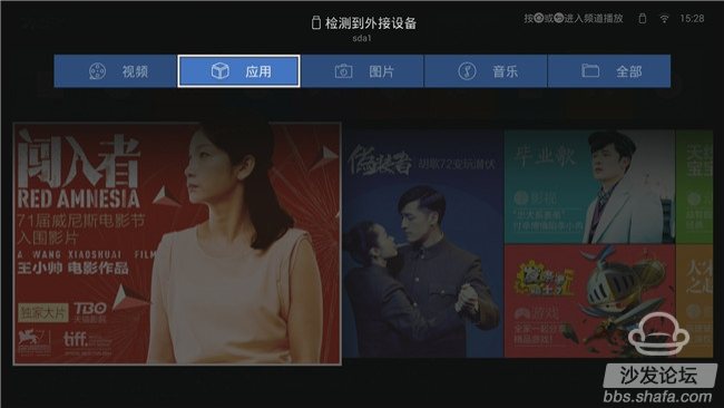 2、將U盤插到天貓魔盒的USB接口上,系統檢測到接入的移動設備,會彈出對應的菜單,選擇“應用”。