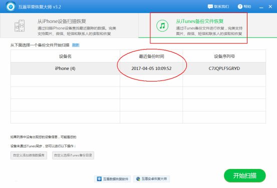 2.在互盾蘋果恢復(fù)大師軟件上選擇剛剛完成的iTunes備份,然后點(diǎn)擊“開始掃描”按鈕開始掃描手機(jī)上的數(shù)據(jù)。