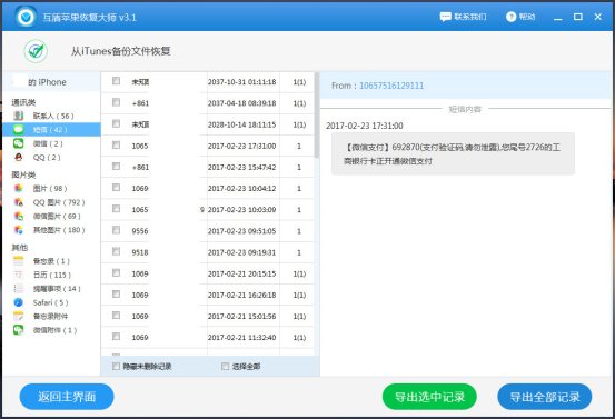 4.勾選需要恢復(fù)的短信,然后點(diǎn)擊“導(dǎo)出選中記錄”導(dǎo)出所選擇的短信到電腦。導(dǎo)出完成后就可以在電腦上看到恢復(fù)后的短信內(nèi)容了。