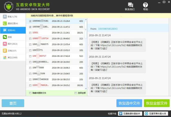 4.掃描結(jié)束后在左側(cè)可以看到“短信”,點(diǎn)擊選擇,在界面右邊即可查看全部恢復(fù)的手機(jī)短信。掃描結(jié)果中紅色的短信是以及刪除的短信,點(diǎn)擊每一條短信可以預(yù)覽詳細(xì)的內(nèi)容。勾選好需要恢復(fù)的短信,最后點(diǎn)擊“恢復(fù)選中文件”,短信就會(huì)導(dǎo)出到電腦上。