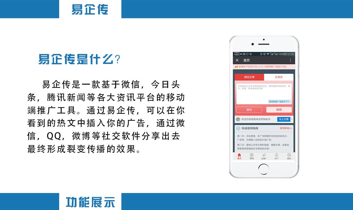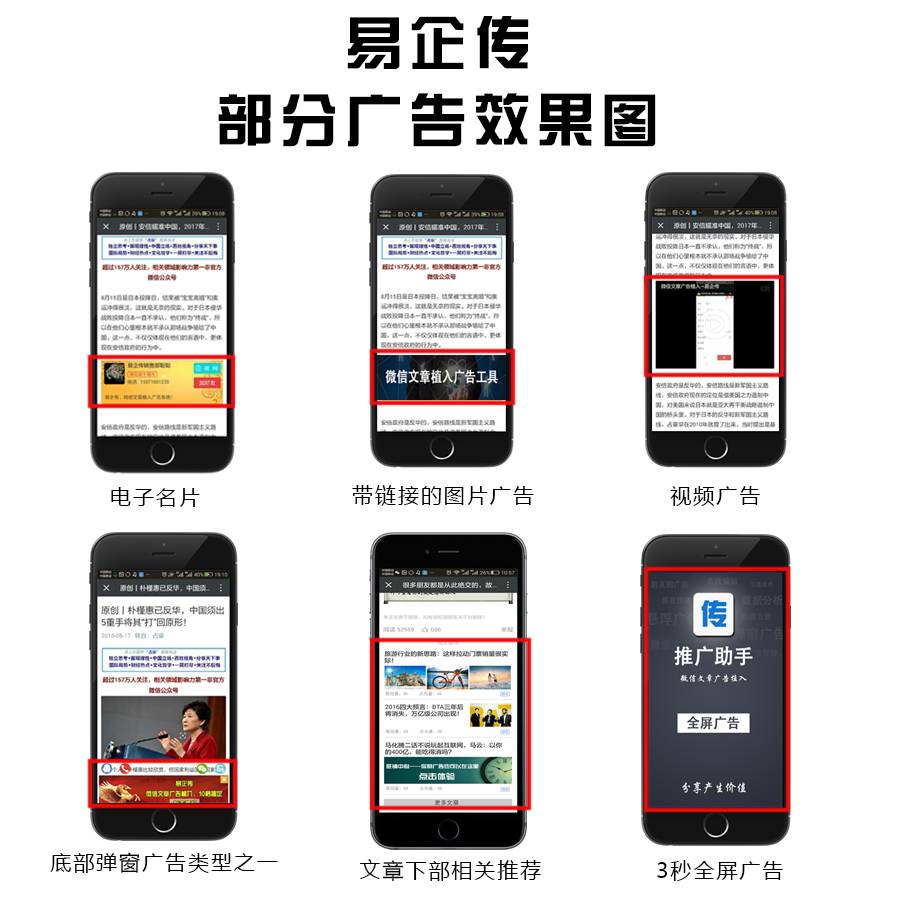 這里保舉一個(gè)品牌叫易企傳,大家可以從網(wǎng)上搜索一下,它是一款廣告植入工具,很適合沒(méi)有網(wǎng)絡(luò)經(jīng)驗(yàn)的人,直接快速的在熱門(mén)的微信文章中插入你的廣告,便利快捷,很多線下的商鋪老板很喜歡這樣做。