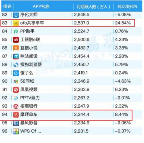 TOP1000 排行榜”,共享單車行業共有兩家企業進入TOP100 榜單,其中,ofo以 2537 萬的活躍用戶數排名總榜單的第 83 位,摩拜單車以2244. 4 萬的活躍用戶排名總榜單的第 94 位,ofo、摩拜單車分列為共享單車行業第一、第二位置。