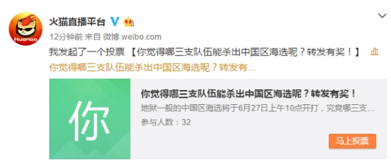 中國區預選賽正賽采用小組賽BO1循環積分賽、正賽GSL賽制的規則,,小組賽第一名將直接晉級TI7正賽階段,2345名將進入第二輪爭奪,倒數五名只能遺憾告別本次TI7的舞臺。進入第二輪的四支戰隊將通過GSL雙敗賽制決出剩下的兩個名額,你們心目中都有哪些戰隊能前往西雅圖?歡迎大家來火貓直播官博參加投票活動:?profile_ftype=1&is_all=1#_0 ,還有機會獲得火貓周邊大禮包哦!快來為你喜歡的戰隊投上一票吧!