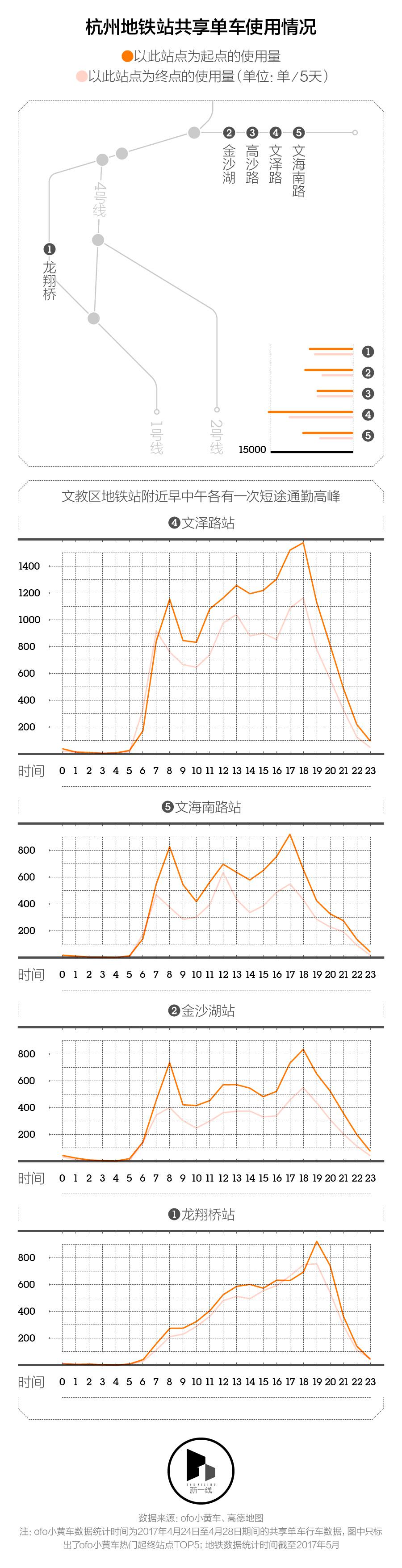 在杭州,平均每天有超過 5000 人騎著ofo小黃車到達(dá)地鐵 1 號(hào)線的文澤路站。它是杭州ofo使用量最大的地鐵站。在與文澤路相鄰、都位于下沙高教區(qū)的文海南路站和金沙湖站,也都有明顯的用車早晚高峰,中午時(shí)間也會(huì)有一個(gè)小高峰——這意味著午餐時(shí)間這里也有必然的單車出行需求。