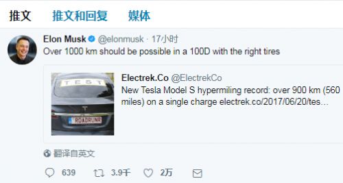 【TechWeb報道】6月22日消息,特斯拉CEO馬斯克在本身的推特賬號上體現,在使用合適的輪胎的情況下,ModelS100D的續航里程應該可以達到1000公里。