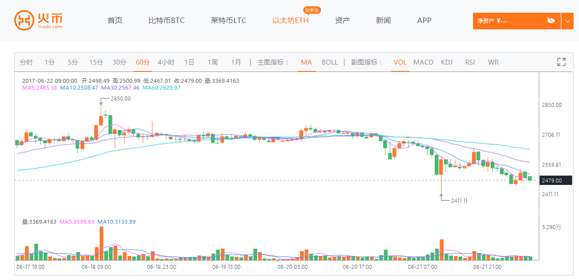 按照中國安適可信賴的以太坊交易平臺火幣網行情顯示,截至北京時間 6 月 22 日 10 點,以太坊價格為 2479 元人民幣。火幣網以太坊今日開盤價格為2546. 7 元,目前最高價格為2588. 88 元,最低價格為 2452 元,跌幅2.66%。