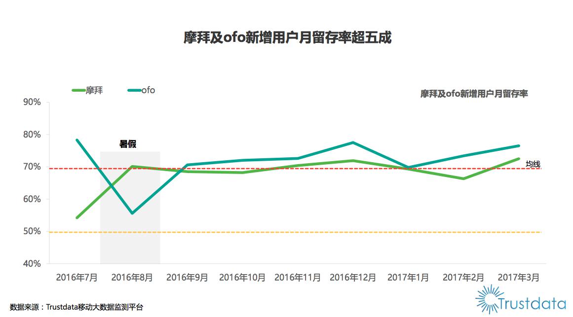而從用戶增速也直不雅觀反映用戶對于共享單車品牌的認可與忠實度,按照Trustdata最新4月數據顯示,ofo3 月新增用戶數在整體行業中占比超41%,是摩拜的近1. 3 倍,超第二名摩拜、第三名酷騎的新增用戶數之和。ofo新增用戶的月留存率始終高于行業70%的平均水平,且連續 8 個月超越摩拜的新增用戶月留存率,行業第一的地位已愈發安靖。