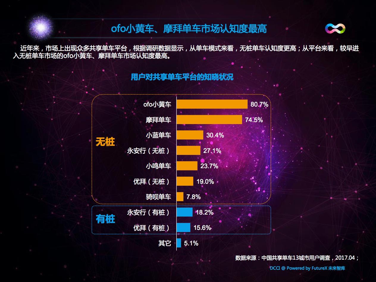 別的,按照最新DCCI發布的《中國共享單車 13 城市用戶研究陳訴》顯示,在市場認知度方面,ofo以80.7%的市場認知度位居行業第一位置,摩拜的市場認知度為74.5%,排名第二,小藍單車市場認知度為30.4%,排名第三。