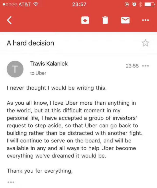 正如你們所知道的,我愛Uber勝過世界上的任何事情,但是在我生命中這個困難的時刻,我接受了一堆投資人的要求選擇靠邊站,這樣Uber才能回到正軌而不會被分心,進而出現其它的爭斗,我會繼續留任董事會,也會隨時隨地幫手Uber成為過去我們所夢想的那樣。
