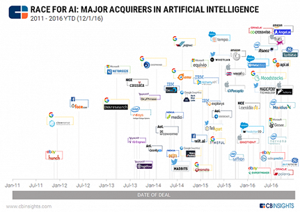 如今市面上巨頭一直在“收割”市面上優(yōu)秀的人工智能團隊,Google、Intel、Apple等等,簡直在角逐收購AI創(chuàng)業(yè)公司。GE、三星等工業(yè)界巨頭也在加入這個行列,普通公司是很難在這個層面上參與競爭的。