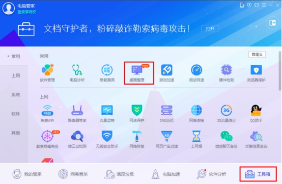 用戶下載或升級騰訊電腦管家最新版本后,在電腦管家首頁底部“工具箱”中找到“桌面整理”功能進行下載升級,升級后點擊右鍵即可進行文件映射功能的操作,而文件搜索按鈕升級后會自動在桌面生成,用戶可隨意使用。