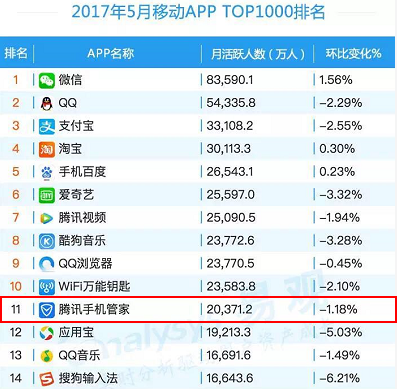 2017 年 6 月 15 日,易不雅觀智庫發布 5 月最新APP TOP1000 排行榜。榜單顯示,除了社交、資訊和生活領域應用強勢占據排行榜前列,安適類APP騰訊手機管家躋身榜單第 11 位,以20371. 2 萬月活躍用戶量位列安適軟件第一。