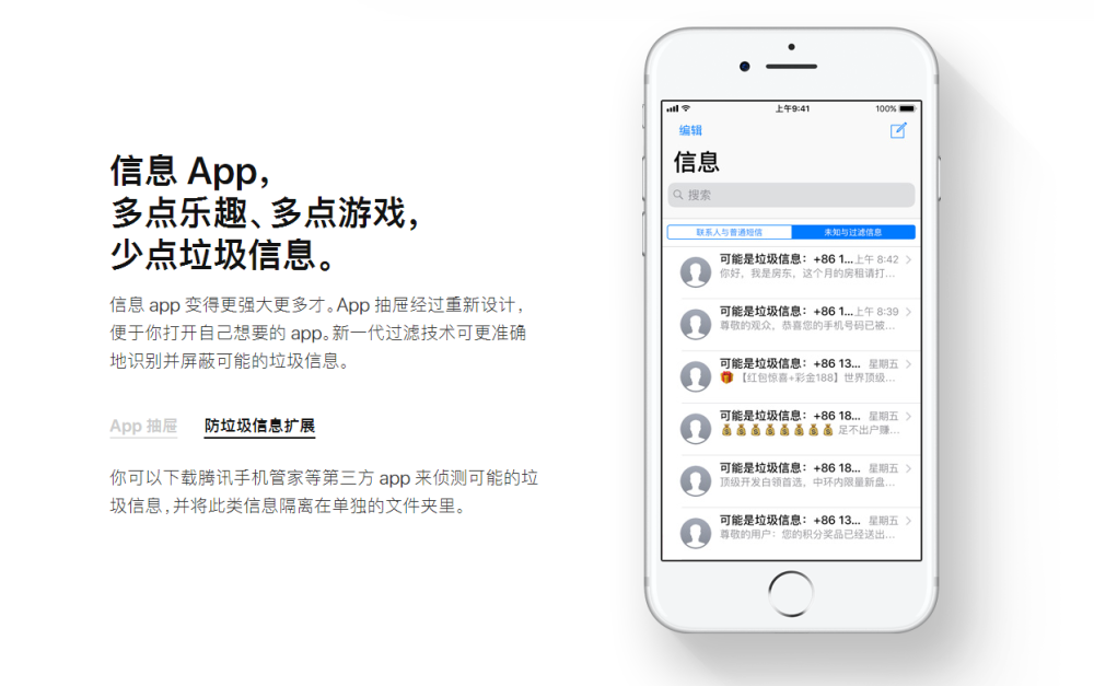 在剛剛過去的WWDC2017 大會上,蘋果頒布頒發iOS11 系統新增垃圾短信識別功能,iPhone用戶通過騰訊手機管家提供的“防騷擾及詐騙短信”辦事,可以防治垃圾短信。在蘋果官網上,我們可以看到對該功能的介紹:“你可以下載騰訊手機管家等第三方app來偵測可能的垃圾信息,并將此類信息隔離在單獨的文件夾里?!币簿褪钦f,iOS11 正式發布之后,用戶將獲得由騰訊安適提供的全場景防騷擾掩護。