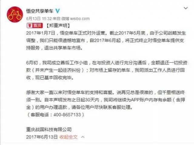 在正式運營僅僅5個月后,重慶戰國科技有限公司發布聲明,正式結束旗下悟空單車辦事,悟空單車退出共享單車市場。聲明稱, 6月初,悟空方面成立善后工作小組,在與投資人進行充分溝通后,全額退還一切投資款;對市場上留存的單車,已派出工作人員進行回收,基本回收完畢。別的,針對用戶已經充值在APP內的款項,也將在30天內管理退款。