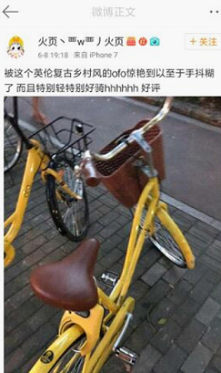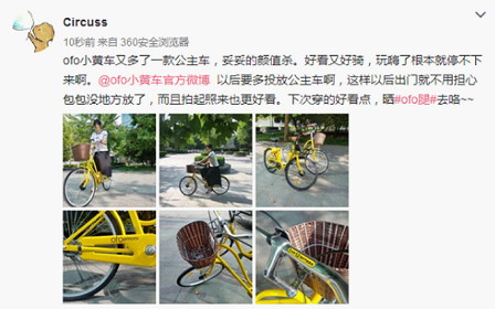 ofo與鳳凰合作生產(chǎn)的ofo公主車一推出,就受到了用戶的廣泛好評。有用戶在微博留言,“被這個英倫復古鄉(xiāng)村風的ofo驚艷到以至于手抖”。還有用戶發(fā)現(xiàn)街頭的ofo公主車,忍不住騎上去兜風,玩得太嗨根本停不下來。可見,ofo公主車深得女性用戶青睞,成為行業(yè)新殺手锏。