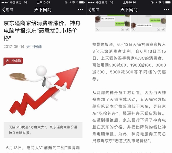 阿里巴巴旗下媒體《天下網(wǎng)商》通過其官方公眾號(hào)發(fā)布了一則題為《京東逼商家給消費(fèi)者漲價(jià),神舟電腦舉報(bào)京東“惡意擾亂市場(chǎng)價(jià)格”》的報(bào)道。
