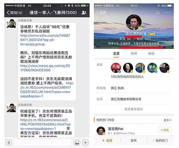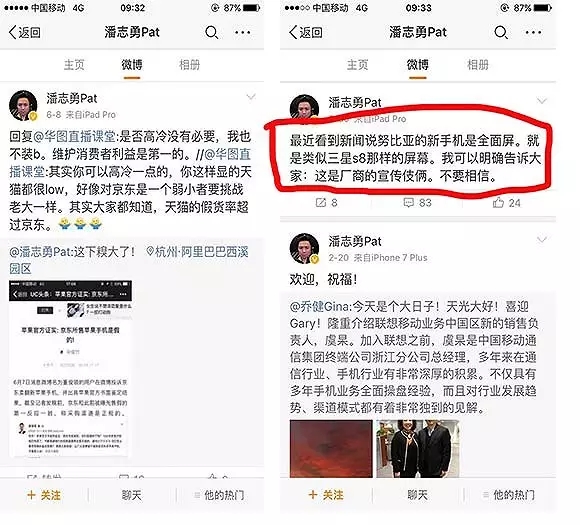 而潘志勇隨后在微博中回應(yīng)稱,“我在一個(gè)群里面說了幾句話,就被又被媒體寫我大量發(fā)京東黑稿。。。第一,我確實(shí)是天貓手機(jī)負(fù)責(zé)人,天貓手機(jī)本次618完勝,并且天貓手機(jī)天天618,這僅僅是開始;第二,我就問這些媒體報(bào)道京東的事情是不是事實(shí)嘛。你在怕什么?”。