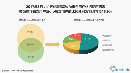 Trustdata的《 2017 年Q1 中國共享單車行業用戶監測陳訴》還顯示, 3 月的共享單車月活躍用戶貢獻度超50%,ofo小黃車新增用戶占比超41%,遙遙領先其他競爭對手,超二三名之和。ofo的獨立用戶約為摩拜的120%,備受用戶偏愛。