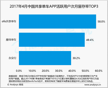 按照第三方權威數據機構易不雅觀陳訴顯示,本年 4 月,ofo小黃車APP活躍用戶次月留存率達到58.0%,領先于摩拜單車和永安行,排名行業第一。