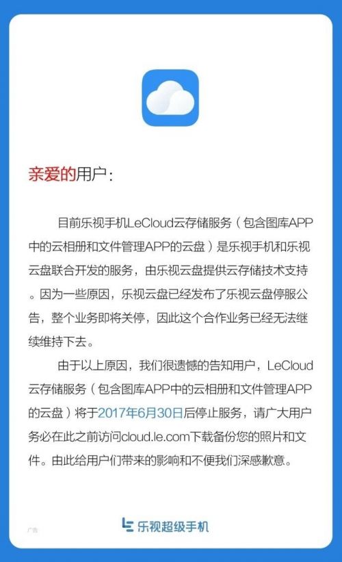 樂視官方稱,樂視云存儲辦事(包羅圖庫APP中的云相冊和文件辦理APP的云盤)將于 2017 年 6 月 30 日后停止辦事,請廣大用戶務必在此之前拜候