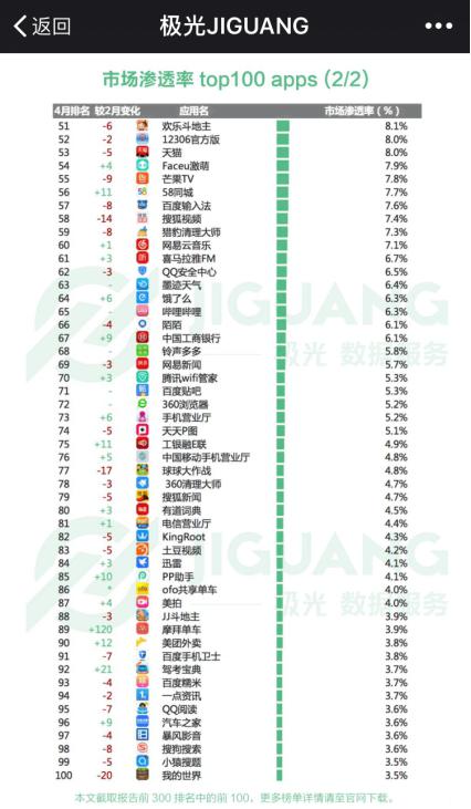 而同時,在最新權威數(shù)據(jù)極光大數(shù)據(jù)發(fā)布的《 2017 年 4 月App風云榜》顯示,在市場滲透率方面,ofo以高達4.04%的市場滲透率穩(wěn)居行業(yè)第一,摩拜單車以3.87%滲透率跟隨其后。更值得一提的是,ofo的滲透率始終連結著較快的增速,成為 4 月整個榜單中的最大黑馬;摩拜排位上升也較快,但仍落后于ofo。