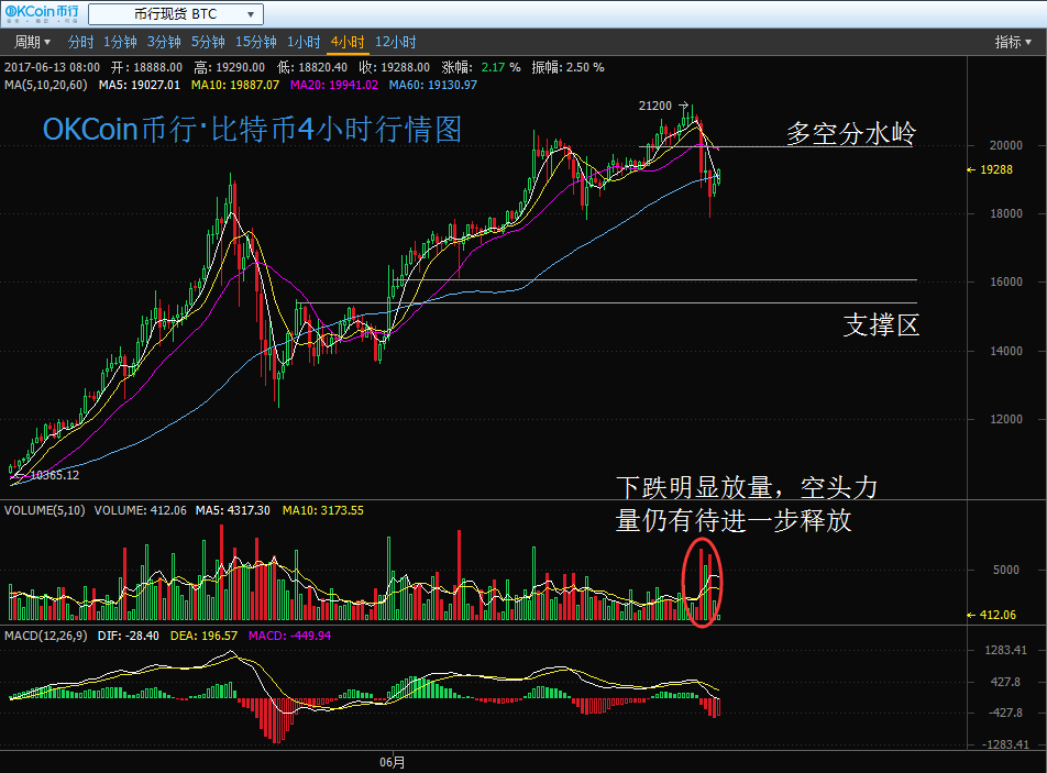 按照國(guó)內(nèi)知名的比特幣交易平臺(tái)OKCoin幣行網(wǎng)的數(shù)據(jù)顯示,昨天(6月12日)幣價(jià)開(kāi)市后小幅攀升向上創(chuàng)出歷史新高后便陷入長(zhǎng)時(shí)間盤(pán)整,盤(pán)整從開(kāi)市后不久一直延續(xù)至亞市下午盤(pán)17點(diǎn),18點(diǎn)時(shí)段開(kāi)市后幣價(jià)一個(gè)小時(shí)大幅下挫近1600點(diǎn),隨后止跌小幅反彈。截止今日發(fā)稿前,價(jià)格最低一度觸及17889一線低點(diǎn),最新已反彈至19250附近。