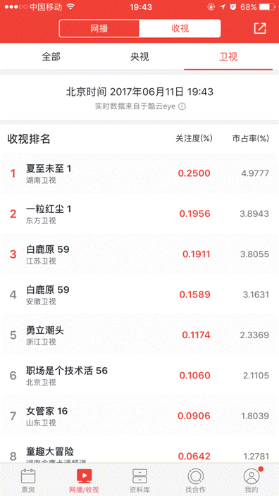 在《歡樂頌2》結尾后,除了《夏至未至》開播,另一部主打都市男女感情劇《一粒紅塵》也迎來首播,貓眼專業版以關注度0.1956%,市占率3. 8943 在晚間19: 43 的黃金時段衛視排名第二,,兩劇一起成功接棒《歡樂頌》,掀起又一波暑期收視新高潮。
