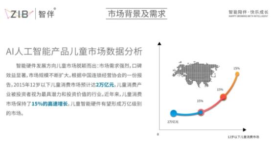 2017 政府工作陳訴中,總理提出要加快培育壯大人工智能興新產業。國內二胎開放,未來五年還是呈直線上升趨勢!當滿大街都在瞄準女性市場,零空白的兒童市場、高科技領域板塊,目前唯有智伴! 2 萬億的消費規模仍在以15%的速率高速發展。