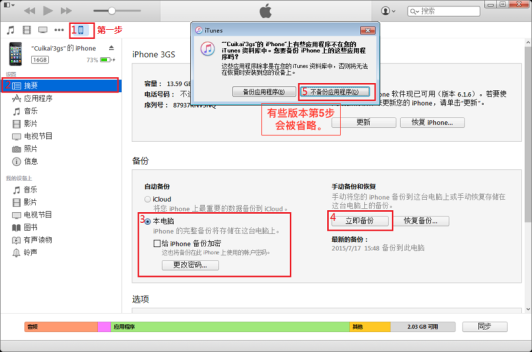 iTunes備份過程很簡(jiǎn)單,首先通過USB數(shù)據(jù)線把電腦和手機(jī)進(jìn)行連接,然后運(yùn)行iTunes工具。如下圖在iTunes工具中,點(diǎn)擊頂部工具欄的手機(jī)圖標(biāo)按鈕,將會(huì)進(jìn)入手機(jī)的辦理摘要界面,然后在備份欄目里,勾選“本電腦”(必然不要勾選“給iPhone備份加密”選項(xiàng)),最后點(diǎn)擊“立即備份”按鈕開始備份手機(jī)數(shù)據(jù)。