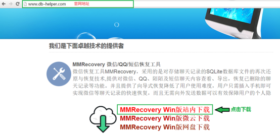 如下圖在瀏覽器的地址欄中輸入MMRecovery產(chǎn)品的官方網(wǎng)址 ( ),打開官方網(wǎng)頁后在網(wǎng)頁中找到下載地址點(diǎn)擊下載,該工具是綠色軟件下載后解壓一下就可以直接使用了。