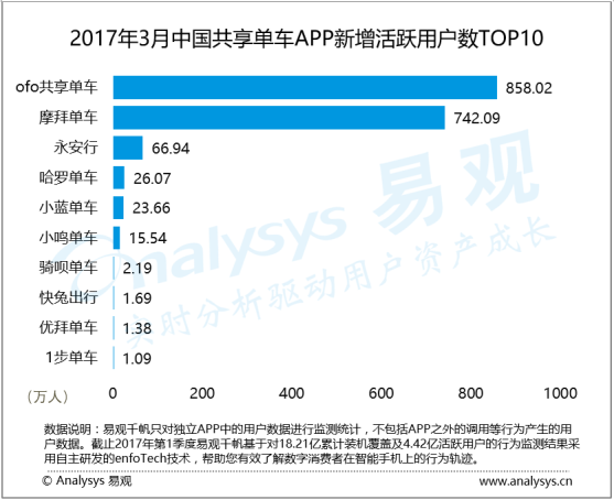 別的,易不雅觀3月數據也顯示,ofo新增用戶數同樣遠超摩拜單車及永安行新增用戶的總和。其中,ofo新增用戶數858.02萬人排名第一,摩拜單車新增用戶數為742.09萬人、永安行新增用戶數為66.94萬。