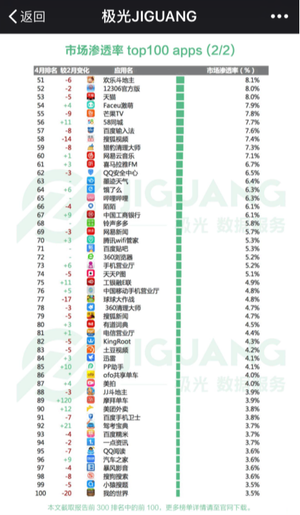 第三方權威數據機構極光大數據發(fā)布的《2017年4月App風云榜》榜單顯示,共享單車“彩虹大戰(zhàn)”依舊如火如荼,市場形成黃橙兩大“主力選手”,市場滲透率方面,ofo以4.04%的市場滲透率行業(yè)第一。