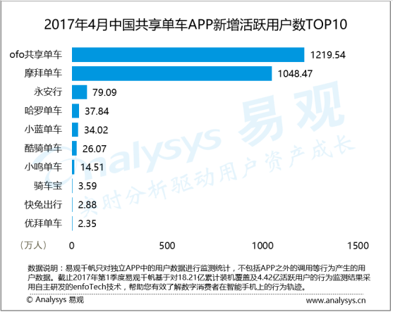 在APP新增活躍用戶數方面,易不雅觀數據顯示,2017年4月份,ofo共享單車APP新增活躍用戶數1219.54萬人,排名第一,摩拜單車新增用戶為1048.47萬排名第二,永安行新增用戶為79.09萬排名第三。值得一提的是,ofo新增用戶數超摩拜、永安行總和近百萬,穩(wěn)居行業(yè)第一。