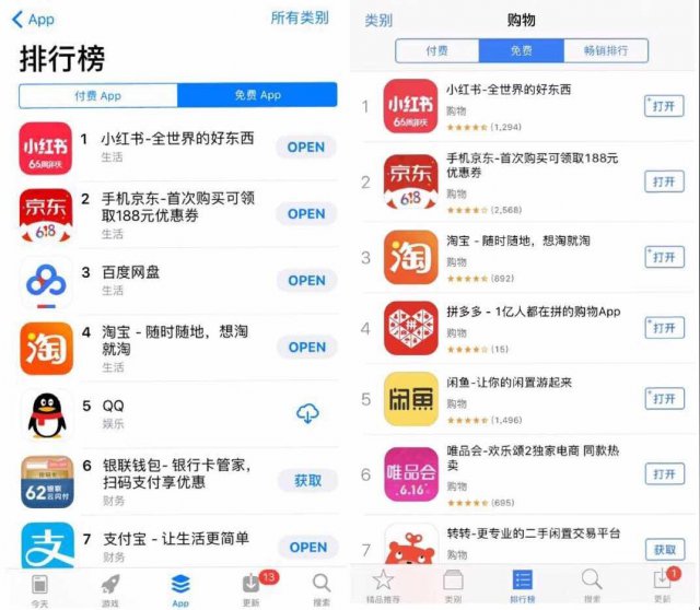 6 月 6 日當天小紅書在蘋果 App Store 購物類下載排名第一,現在在免費總榜單排名第一了;