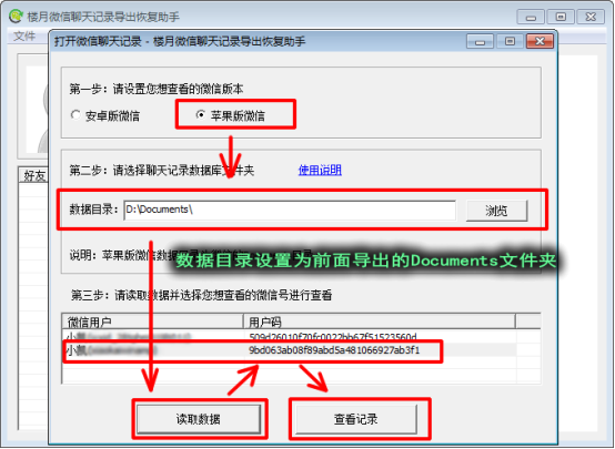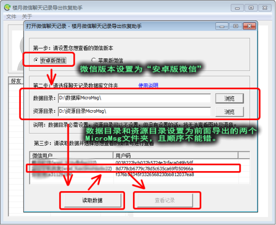 7,接下來就輪到微信聊天記錄恢復神器出場了,下載并打開“樓月微信聊天記錄導出恢復助手”,按下圖進行設置并點擊。