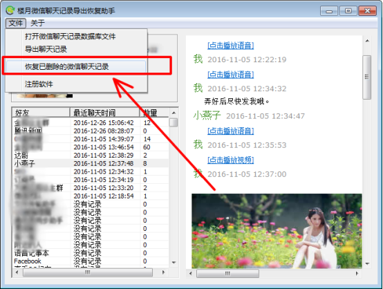 5,現在,不管是與“普通伴侶”的聊天記錄,還是與私密好友在微信語音中收發的喃喃細語,都可在界面上進行查看或播放了。但現在還不是神奇的時候,因為本軟件還可以恢復手機上刪除的微信聊天記錄,方法也很簡單,只需要點擊一下下圖所示功能菜單即可。