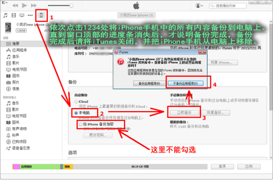 2,然后在電腦上安置并運行iTunes軟件(在百度上搜索即可下載),使用該軟件將iPhone手機上的全部數據都備份到電腦上,具體操作如下圖所示。