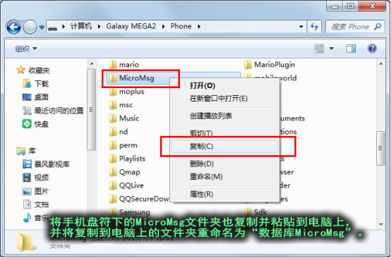 2,接下來我們要把生存了微信聊天記錄中的語音文件,,圖片,及視頻的資源目錄從手機上復制到電腦上,方法很簡單,進入手機盤符后,然后把tencent目錄下的MicroMsg復制并粘貼到電腦上即可。注意在復制后,請按F2對復制到電腦上的文件夾進行重命名。注意:該文件夾通常會較大,復制后請將下圖資源辦理器窗口最小化,切勿關閉,如果關閉了下圖所示資源辦理器窗口的話,有可能會導出粘貼不可功。