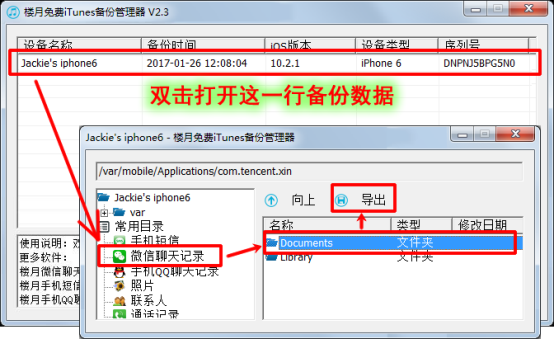 3,備份完成后,請接著安置并打開“樓月免費iTunes備份辦理器”,從軟件名稱就可以知道,該軟件能夠辦理從iTunes中備份到電腦上的iPhone數據。運行后,請按下圖所示步驟,將生存了微信聊天記錄的Documents文件夾全部導出到電腦上。