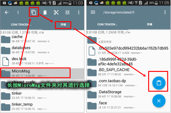 5,在手機上打開剛安置的app,并一步步點擊進入到data/data/com.tencent.mm,再把該目錄下的MicroMsg文件夾復制并粘貼到“存儲”選項卡下。