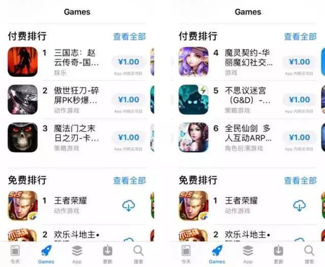 不過這次對業界造成最大影響的,恐怕是App Store直接在主界面取消了榜單選項,暢銷榜更是徹底消失了,被保存下來的付費榜和免費榜在一級頁面更是只顯示前三名。在此之前,暢銷榜是AppStore的重要流量入口,用戶通過榜單拔取應用已形成習慣。但改版之后,暢銷榜這一重要的流量入口被徹底封死。
