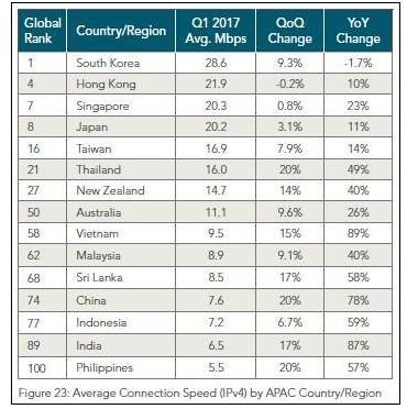 部分亞太國(guó)家和地區(qū)網(wǎng)速數(shù)據(jù)還顯示,挪威以23.5Mbps的平均網(wǎng)速排在第二位。中國(guó)香港地區(qū)平均網(wǎng)速為21.9Mbps——位居第四,同比增長(zhǎng)10%;臺(tái)灣地區(qū)平均網(wǎng)速為16.9Mbps——排在第16位,同比增長(zhǎng)14%。美國(guó)平均網(wǎng)速增長(zhǎng)22%至18.7Mbps。