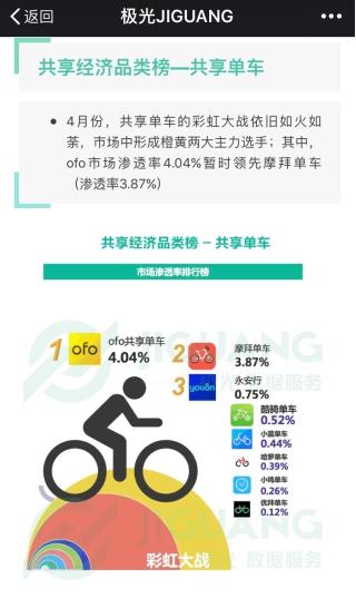 6 月 2 日,第三方權威數據機構極光大數據發布的“ 2017 年 4 月App風云榜”榜單顯示,共享單車彩虹大戰依舊如火如荼,市場形成黃橙兩大主力選手。市場滲透率方面,ofo以4.04%的市場滲透率穩居行業第一,摩拜單車以3.87%滲透率跟隨其后、排名第二。