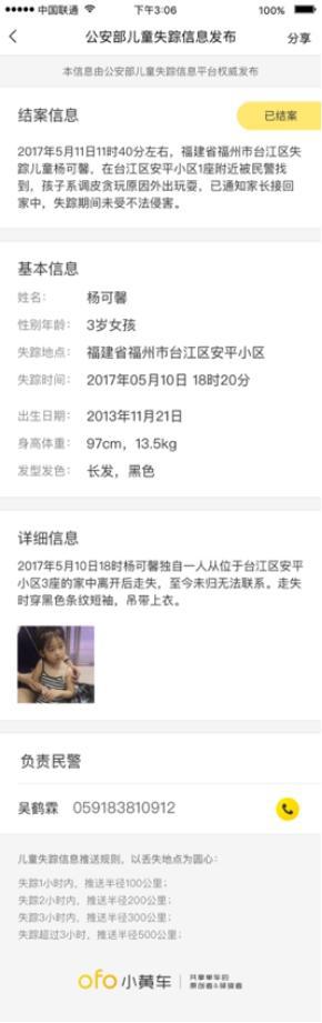 目前,ofo小黃車入駐全球 4 個國家的 100 座城市,連接 600 萬輛共享單車為用戶提供超過 10 億次出行辦事。而從市場占有率來看,ofo市場占有率高達51.9%,已經形成了絕對優勢。接入公安部“兒童失蹤信息發布平臺”后,ofo將在全國近 100 座城市的用戶App中,第一時間發布公安部權威發布的兒童失蹤信息,用戶點擊即可查看兒童的照片、姓名、年齡、身高、失蹤地點等個人資料,根據信息頁提示,直接撥打民警電話提供線索,,幫手失蹤兒童回家。